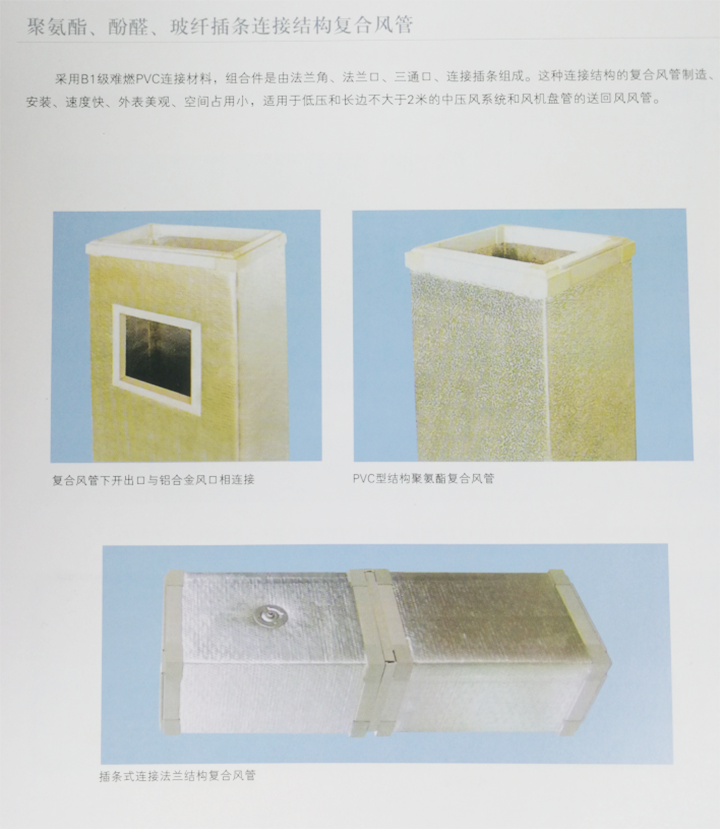 酚醛復合風管中間層為酚醛泡沫,內外層為壓花鋁箔復合而成。酚醛泡沫板與鋁箔復合制成夾芯板,然后加上專用法蘭配件,制成的酚醛復合風管用于中央空調通風。